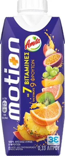 Η Amita Motion, είναι ο πρώτος 100% φυσικός χυμός με 9 φρούτα και 7 βιταμίνες, που έχει ξεχωρίσει στην ελληνική αγορά. Έχει καταφέρει να γίνει ο αγαπημένος χυμός των νέων και όχι μόνο, με την άρρηκτη ταύτισή του τόσο με τη φυσική ενέργεια και τη διατροφική αξία όσο και με την έκφραση της Θετικής Ενέργειας που ο καθένας κρύβει μέσα του και μοιράζεται με τους γύρω του. Ένα ποτήρι Amita Motion 200ml καλύπτει το 40% της Συνιστώμενης Ημερήσιας Παροχής στις βιταμίνες, που περιέχει ο χυμός (Βιταμίνη C, βιταμίνη B6, Βιταμίνη Β12, Βιοτίνη, Βιταμίνη Ε, Νιασίνη, Φoλικό οξύ). Πλέον κυκλοφορεί και με μη αποσπώμενο καπάκι συμβάλλοντας στον περιορισμό των απορριμμάτων με την ανακύκλωση ολόκληρης της συσκευασίας.